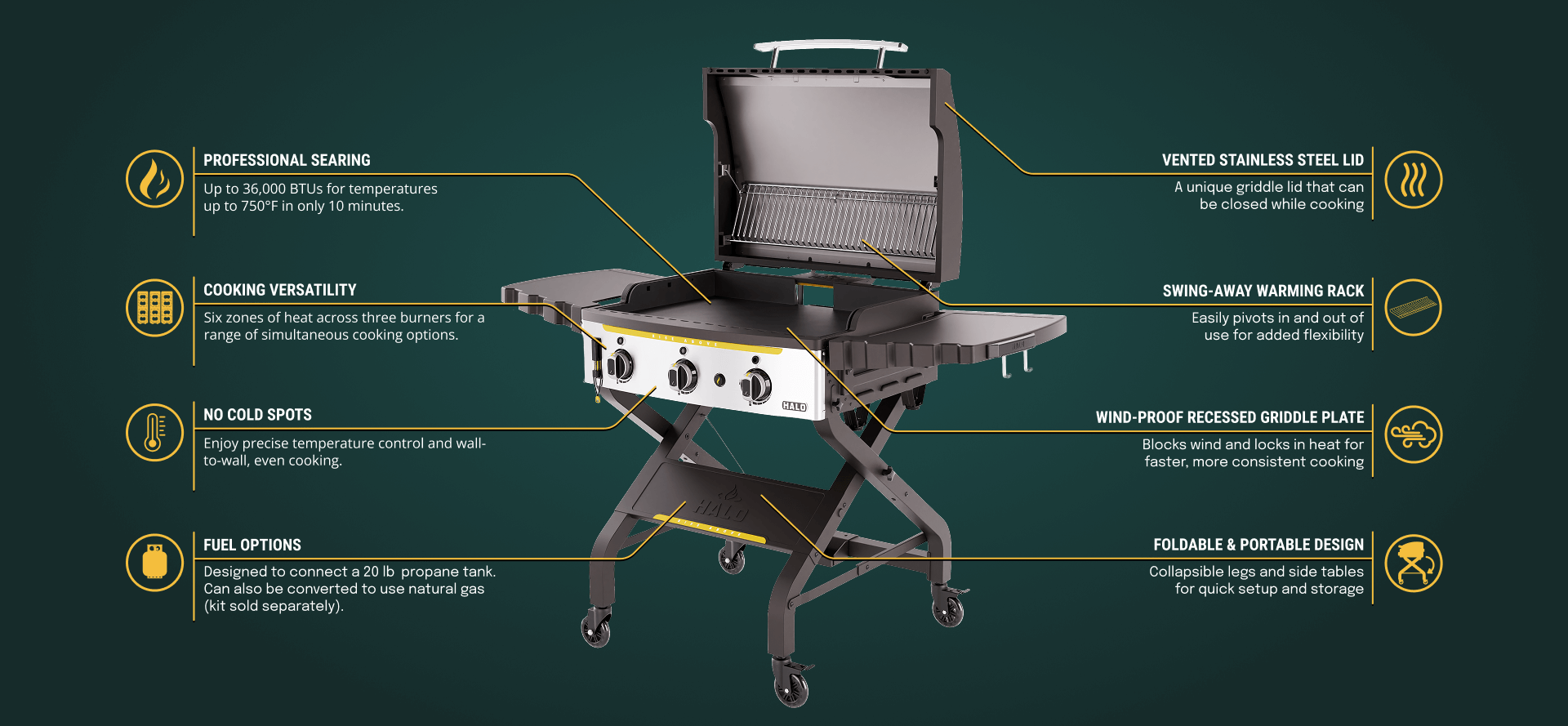 The HALO Elite3B Outdoor Griddle is built for family nights, outdoor cookouts, and gatherings that require some extra cooking room.